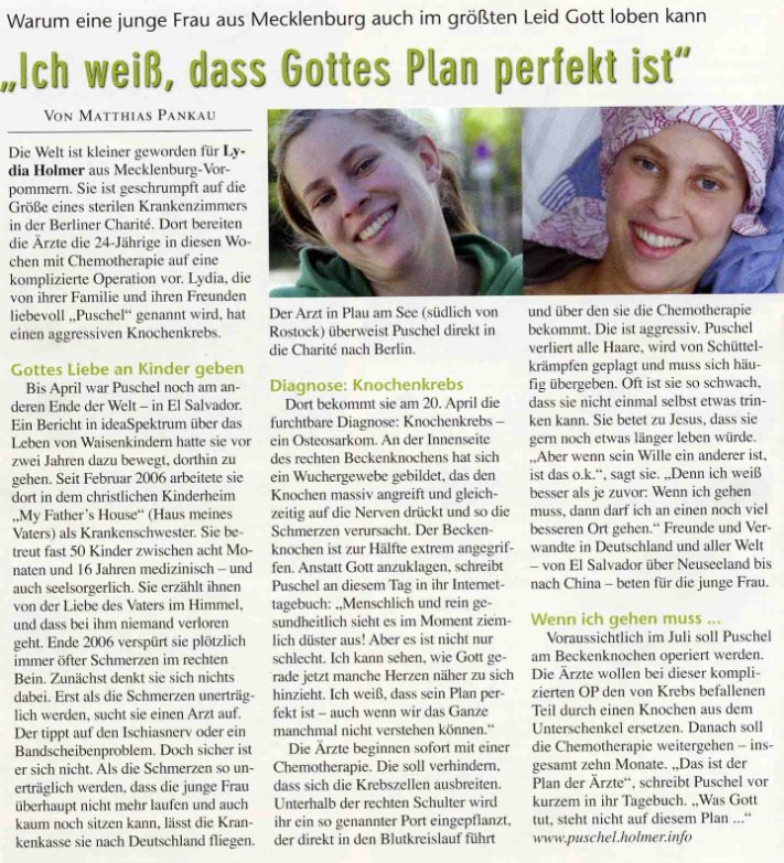 Für Blinde, die geschriebenen Text von ihrer Software vorgelesen bekommen, ist hier eine kurze Einführung: Die Welt ist kleiner geworden für Lydia Holmer aus Mecklenburg-Vorpommern. Sie ist geschrumpft auf die Größe eines sterilen Krankenzimmers in der Berliner Charité. Dort bereiten die Ärzte die 24-Jährige in diesen Wochen mit Chemotherapie auf eine komplizierte Operation vor. Lydia, die von ihren Freunden liebevoll ,,Puschel” genannt wird, hat einen aggressiven Knochenkrebs.