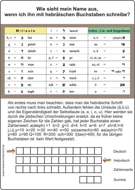 Wie sieht mein Name aus, wenn ich ihn mit hebräischen Buchstaben schreibe? Die hebräische Schrift wird von rechts nach links geschrieben und gelesen. Die meisten Buchstaben haben außerdem einen Zahlenwert.