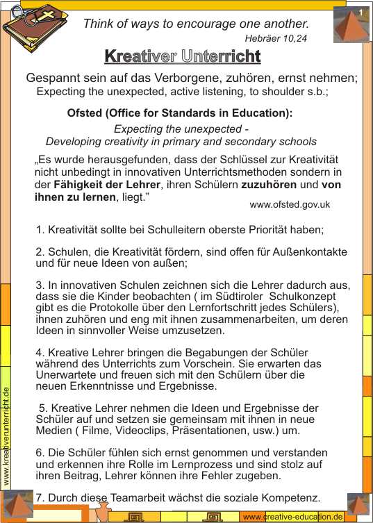 - · Die Kreativität der Kinder wird nicht durch radikale, neue Unterrichtsmethoden gefördert. In innovativen Schulen zeichnen sich die Lehrer dadurch aus, dass sie ihre Kinder beobachten, ihnen zuhören und eng mit ihnen zusammenarbeiten, um deren Ideen in sinnvoller Weise umzusetzen.