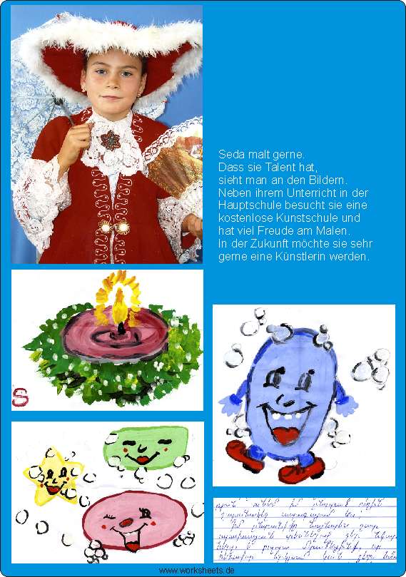 Seda malt gerne. Dass sie Talent hat, sieht man an den Bildern. Neben ihrem Unterricht in der Hauptschule besucht sie eine kostenlose Kunstschule und hat viel Freude am Malen. In der Zukunft möchte sie sehr gerne eine Künstlerin werden. Sie ist seit vielen Jahren unser Patenkind aus Armenien.