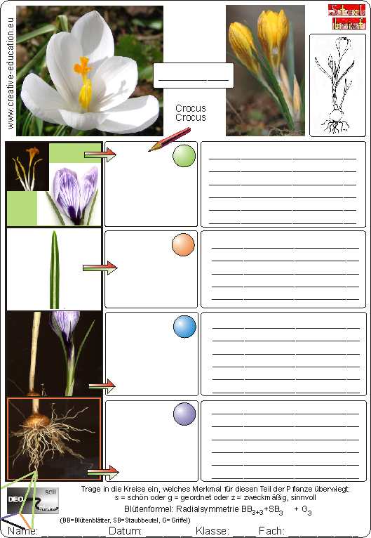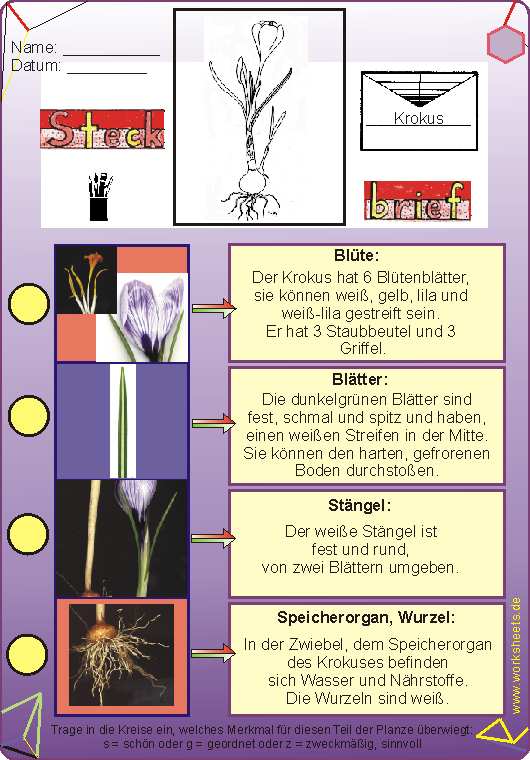 Steckbrief Krokus: Blüte, Blätter, Stängel, Speicherorgan, Wurzel.