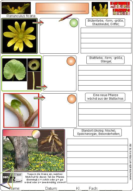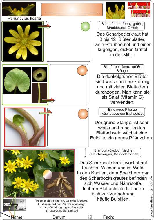 Steckbrief Scharbockskraut: Blüte, Blätter, Stängel, Speicherorgan, Wurzel.