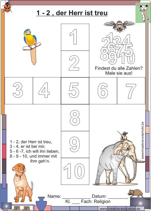 1-2, der Herr ist treu, 3-4, er ist bei mir, 5-6-7, ich will ihn lieben, 8-9-10 und immer mit ihm gehn.