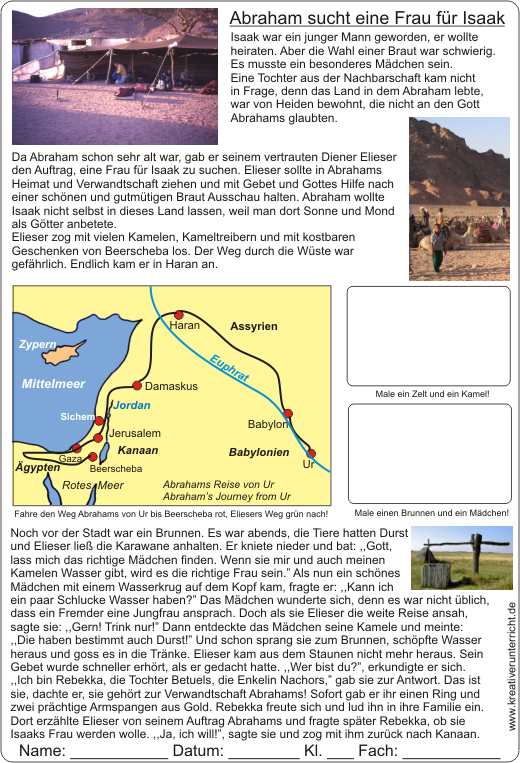 Abraham lässt seinen Diener Elieser eine Frau für Isaak suchen.