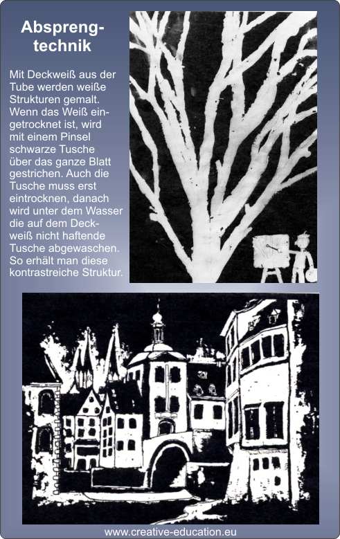 Mit Deckweiß aus der Tube werden weiße Strukturen gemalt. Wenn das Weiß ein- getrocknet ist, wird mit einem Pinsel schwarze Tusche über das ganze Blatt gestrichen. Auch die Tusche muss erst eintrocknen, danach wird unter dem Wasser die auf dem Deckweiß nicht haftende Tusche abgewaschen.So erhält man diese kontrastreiche Struktur.