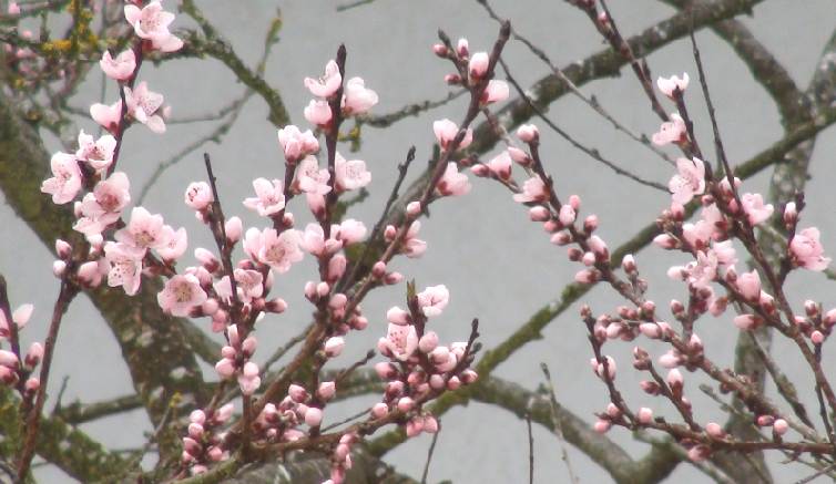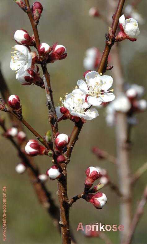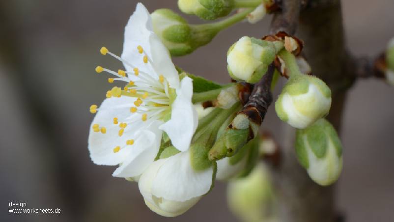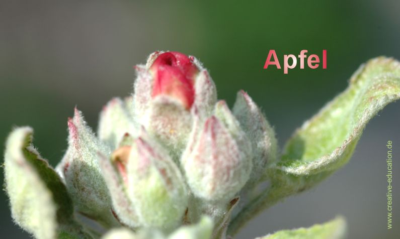 Wie man sieht, wagt sich die Apfelblüte nur zaghaft aus ihrer Knospe. Fünf bis sieben Blüten und etliche Blätter waren in der kleinen Knospe eingewickelt. Weil sie im Vorjahr perfekt nach einem bestimmten Bauplan im Winzigformat vorbereitet wurden, können sie sich jetzt ent-wickeln.