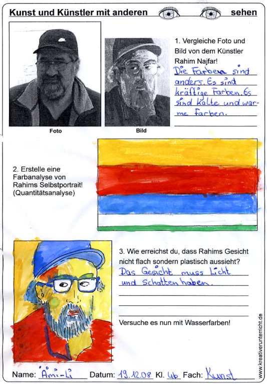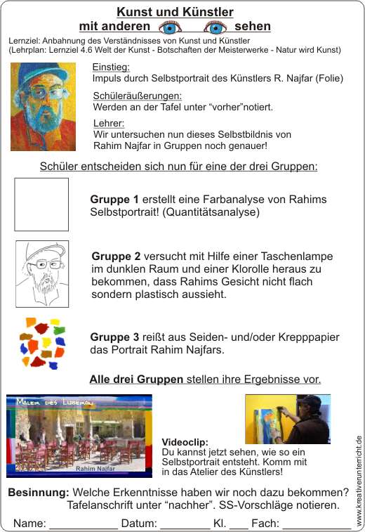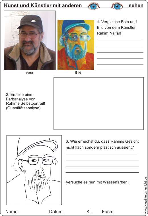 Botschaften der Meisterwerke - Kunst und Künstler mit anderen Augen sehen - Arbeitsblatt zur Wiederholung und Festigung zum Selbstportrait des Künstlers Rahim Najfar aus dem Luberon