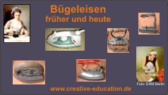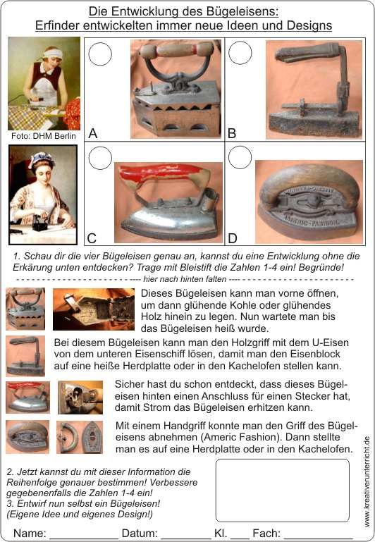 Schüler müssen selbst ihre Vermutungen über die historische Reihenfolge der vier Bügeleisen entwickeln. Deshalb müssen sie zuerst das Blatt in der Hälfte nach hinten falten. Danach dürfen sie mit der unten stehenden Information ihre Entscheidung überprüfen.