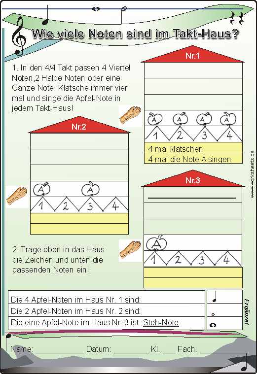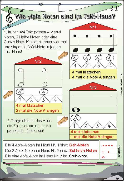 Im Abstand von etwa 3 Metern zeichnet der Lehrer eine Startlinie und eine Ziellinie mit Kreide auf den Fußboden. Auf Bahn 1 muss der Schüler 4 Schritte gehen (=4Punkte mit Kreide), das ind die “Geh-Noten”; auf Bahn 2 (2 Punkte) schleicht der Schüler in der gleichen Zeit nur 2 große Schritte, das sind die “SchleichNoten”; während der Schüler auf Bahn 3 stehen bleibt, das ist die “Steh-Note” (also die Ganze Note im Vier-Viertel-Takt). An der Tafel kann nun diese Start- und Ziellinie mit den verschiedenen Punkten noch einmal aufgezeichnet werden. Mit dem Arbeitsblatt und der dazugehörigen Lösungsfolie kann man das Verständnis des Schülers noch einmal kontrollieren.