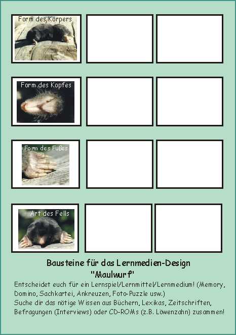 Diese Probe sollte keine normale Probe mit Fragen und Antworten werden, benotet wurde vielmehr die durchdachte Anfertigung eines Lernmittels (DOMINO, LERNSCHIEBER, SACHKARTEI, MEMORY), dessen Inhalt natürlich sachlich richtig sein musste! Kreative Ideen waren ausdrücklich erwünscht - auch und gerade wenn sie nicht dem Unterricht entnommen waren. Das führte erfreulicherweise zu sehr verschiedenen Ergebnissen. Nicht zuletzt auch dadurch wird die Eigeninitiave zum selbständigen, kreativen Denken gefördert, die später im Berufsleben eine große Rolle für Innovationen spielt.