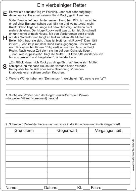 Ein vierbeiniger Retter - Rechtschreibung mit einer Erzählung mit Übung von Zeitwörtern in Grundform, Gegenwart und Vergangenheit.