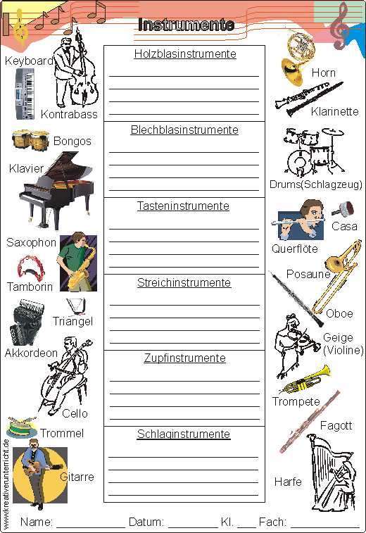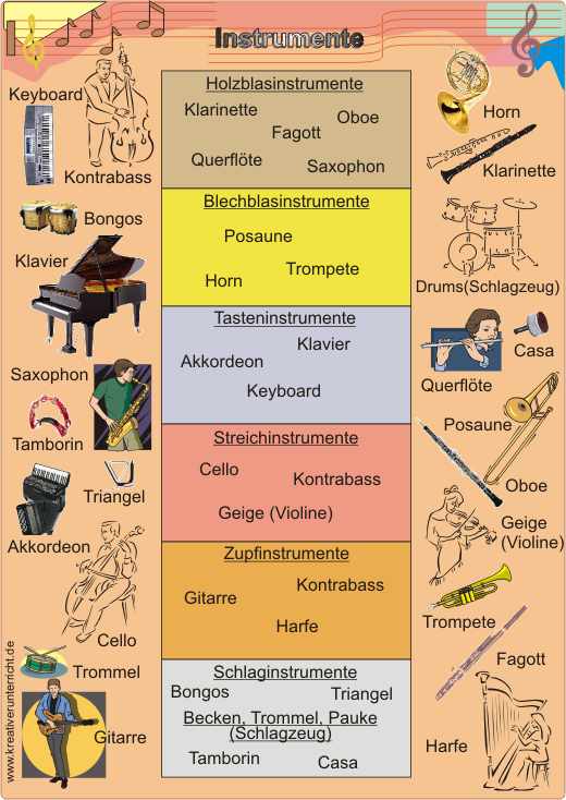Die Einteilung der Instrumente in Holzblas-, Blechblas-, Tasten-, Zupf-, und Schlaginstrumente (Arbeitsblatt + Lösungsfolie auf CD-ROM)