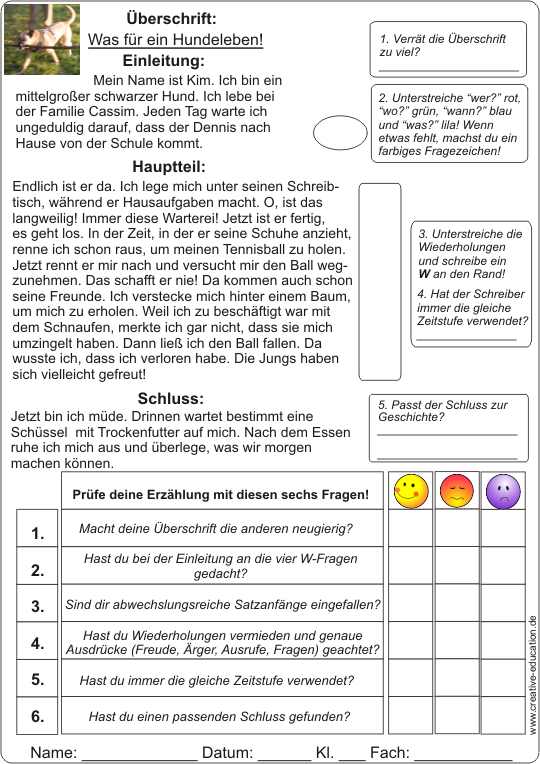 Schüler lernen die Kriterien der Bewertung von Erzählungen kennen. Sie werden im Klassengespräch erarbeitet, können aber auch selbsständig gefunden werden.