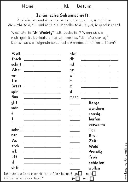 Hier ein Beispiel, wie ich versucht habe, die Fehler der Schüler nach einer Diagnose (Siehe Fehleranalyse) zu therapieren. Hauptfehlerquote war die Groß- und Kleinschreibung (Siehe nachstehendes Arbeitsblatt!). Die zweite Fehlerquelle schienen die mangelnde Konzentration und Wortbildauffassung zu sein. Mit der von mir erfundenen Methode der “Israelischen Geheimschrift” versuchte ich diesem Mangel abzuhelfen.