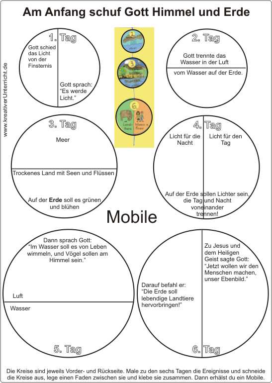 Am Anfang schuf Gott Himmel und Erde. Die sechs Schöpfungstage werden auf einem Mobile sichtbar dargestellt.