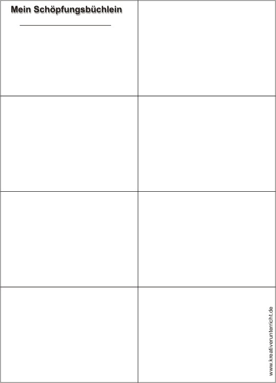 Mein Schöpfungsbüchlein: In die acht Rahmen malen die Schüler die sechs Schöpfungstage, den ersten Satz und den Ruhetag. Danach schneiden sie ihre Bilder aus und der Lehrer heftet diese zu einem Schöpfungsbüchlein zusammen.