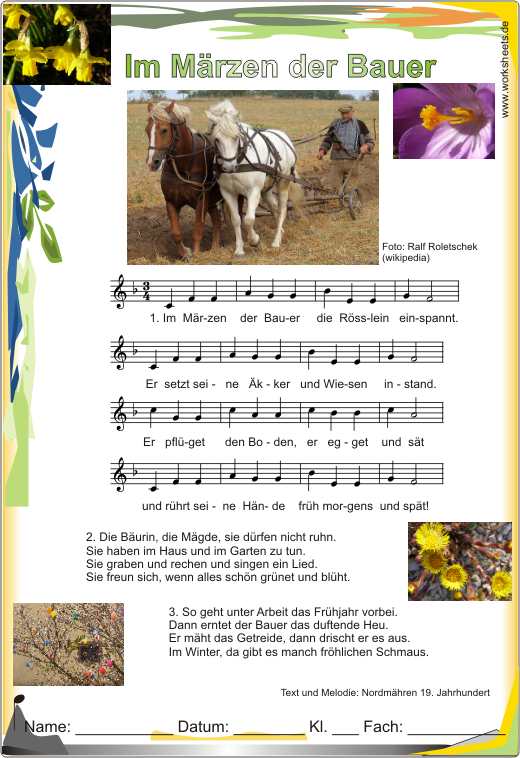 Im Märzen der Bauer die Rösslein einspannt. Ein Volkslied, das an das bäuerliche Jahr von Saat und Ernte erinnert und daran, dass die Milch nicht aus dem Supermarkt, sondern von der Kuh kommt. Das Lied strahlt die Freude über Wachstum, Gedeihen und den Genuss nach der Ernte aus.