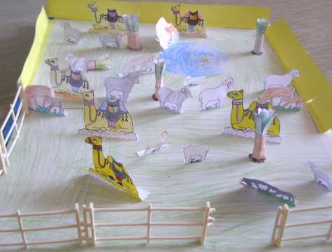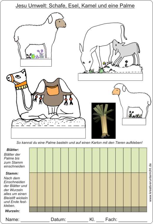 Jesu Umwelt: Schafe, Esel, Kamel und eine Palme zum Basteln. Es kann zum Beispiel in der Klasse in Gruppen ein Dorf in Israel aufgebaut werden.
