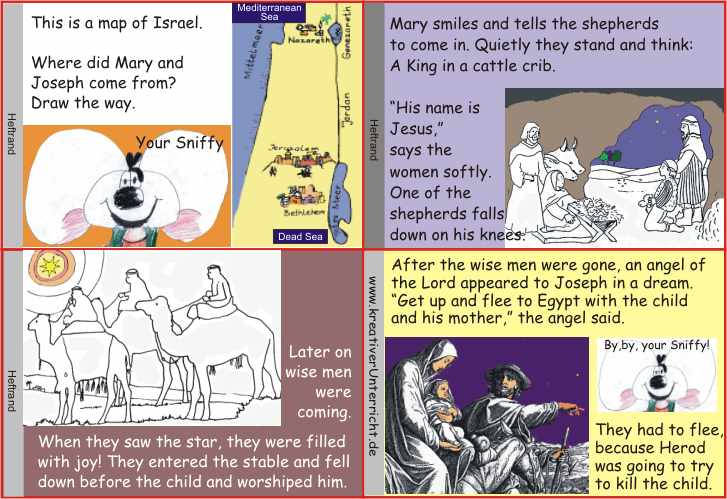 A small book for Christmas. Die Weihnachtsgeschichte wird von der Maus Sniffy (gemalt von Cordula Bogenreuther) erzählt. Im Klassengespräch werden die Lücken ausgefüllt und anschließend die Bilder farbig gestaltet. Alle acht Seiten werden ausgeschnitten und dann zu einem Heftchen zusammengeheftet (Heftrand!).