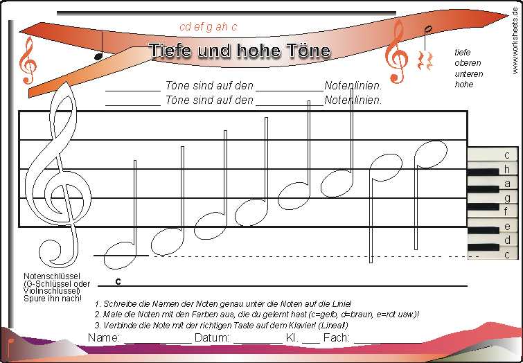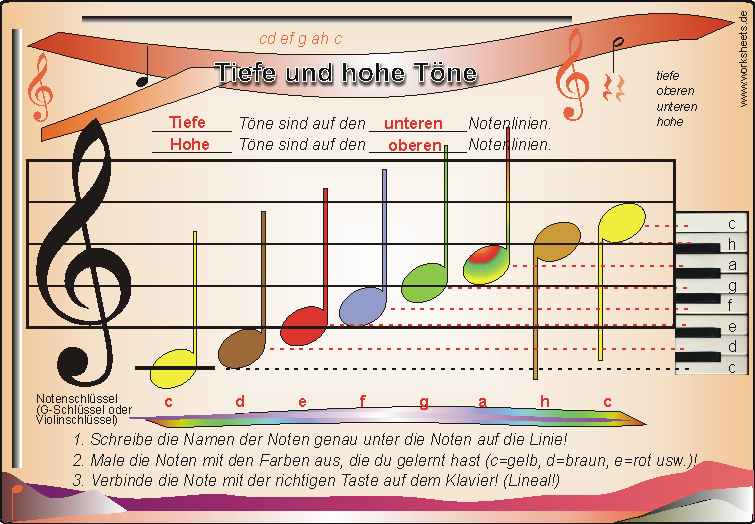 Notation und Klaviermanual entsprechen sich: Hohe Töne ligen oben, tiefe Töne liegen unten. Diese logische Entsprechung wird hier sichtbar und konkret umgesetzt mit Arbeitsblatt und Lösungsfolie.