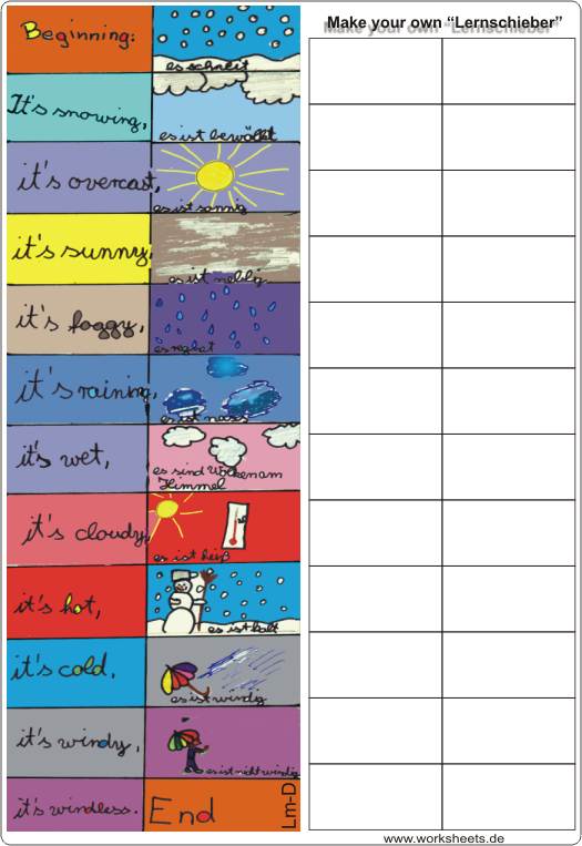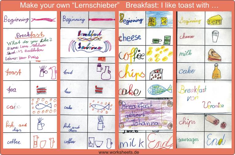 Vier verschiedene Lernschieber von Schülern der 4. Klasse. Auf der Manschette zum Schieben muss das Thema (breakfast) und der Name des Schülers stehen.