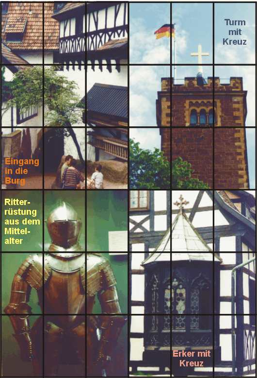 Martin Luther auf der Wartburg - Vier einfache Puzzles - auch für einen Lernzirkel geeignet - werden vom Lehrer oder von den Schülern zerschnitten und dann wieder von Gruppen oder in Partnerarbeit zusammengesetzt.