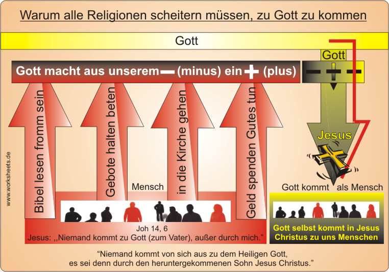 Martin Luther zur Werkgerechtigkeit: Warum alle Religionen scheitern müsen, zu Gott zu kommen. Gott selbst kommt in Jesus Christus zu uns Menschen. Gott ist Mensch geworden. Sein Sohn hat unsere Schuld auf sich genommen. Wenn wir das glauben, ist unsere Schuld weg und wir haben freien Zugang zu Gott.