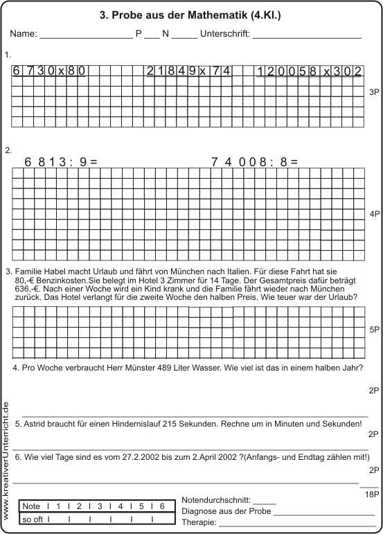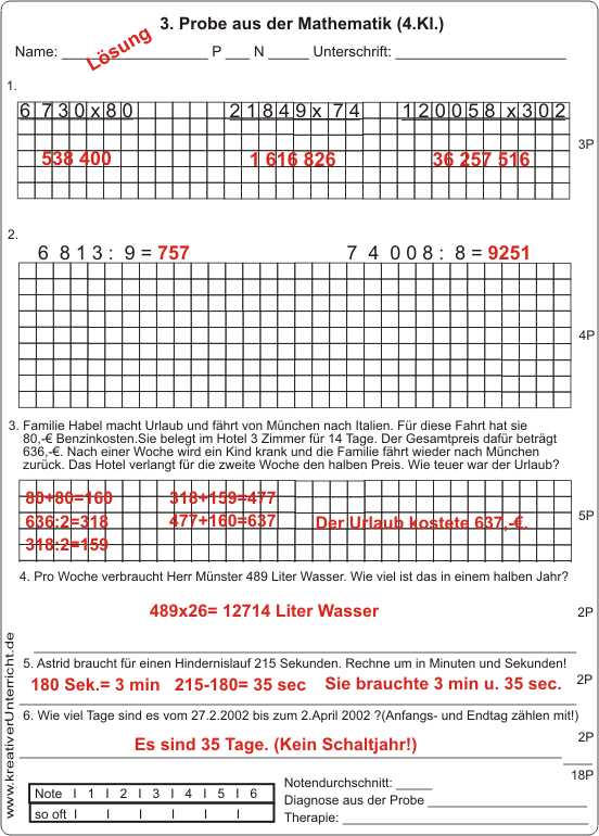 3. Probe aus der Mathematik Klasse 4 Arbeitsblatt und Lösungsfolie