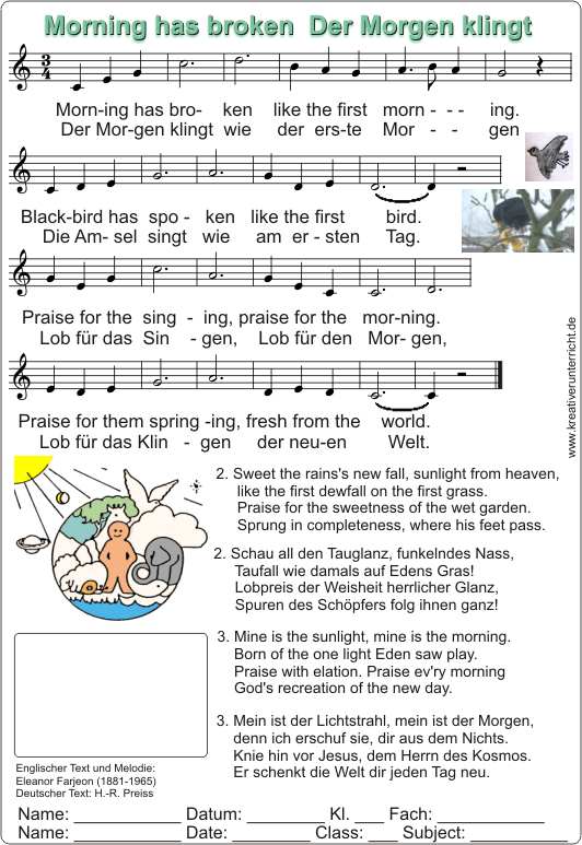 Morning has broken - Der Morgen klingt wie der erste Morgen ...Eignet sich für das Lob des Schöpfers für den Unterricht über die Schöpfung (1. Mose1) oder die Psalmen.