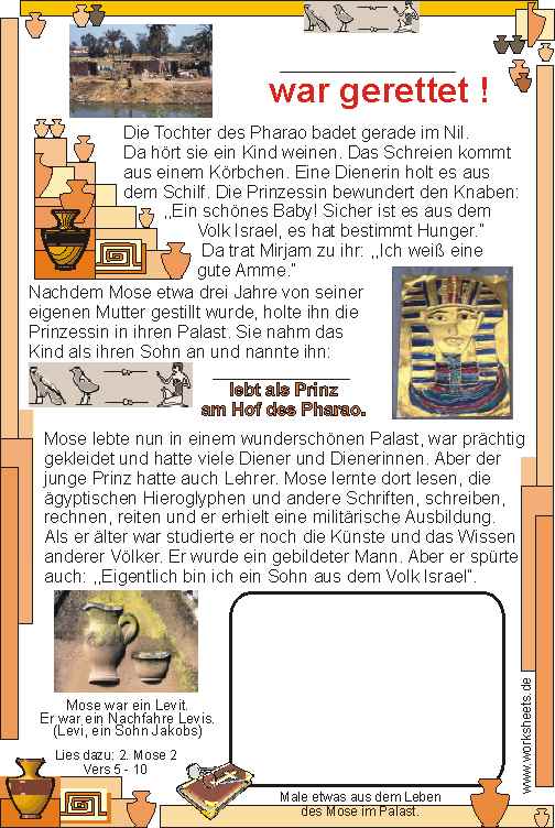 Mose lebt als Prinz am Hofe des Pharao - Arbeitsblatt und Lösungsblatt