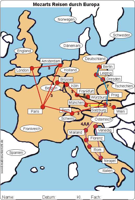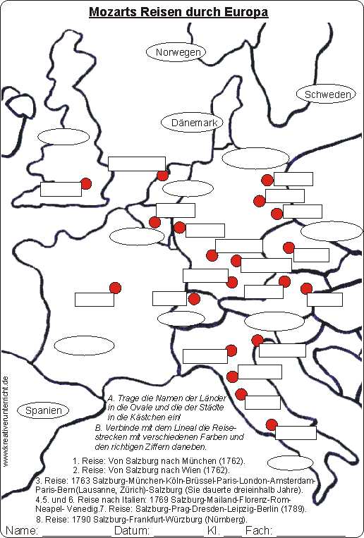 Länder und Städte eintragen und die Reisestrecken mit Lineal verbinden