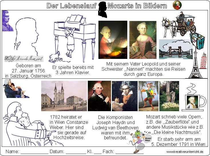 Mozart in Bildern zum Ausmalen, ein einfacher kurzer Lebenslauf. Mozart pics for to paint in. A short Biography