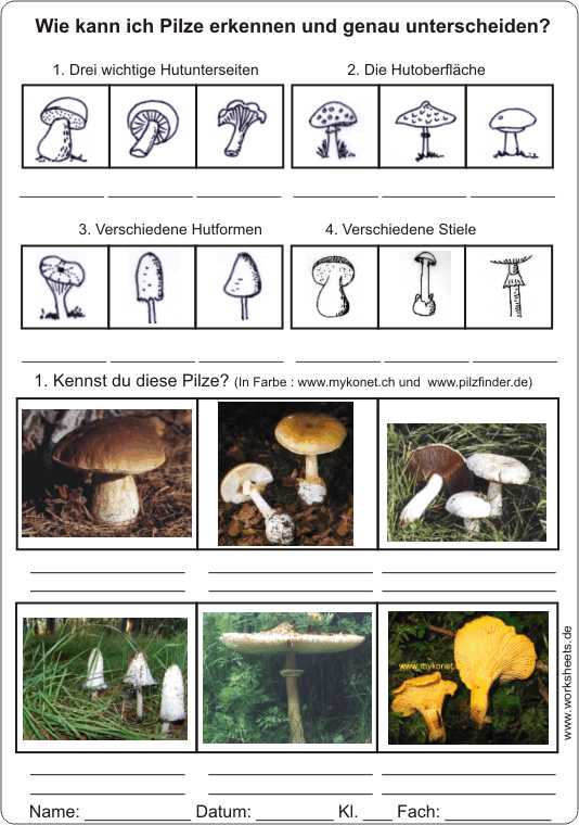 Verschiedene Pilze erkennen und genau unterscheiden nach Formen und Farben - Arbeitsblatt mit Lösungsfolie