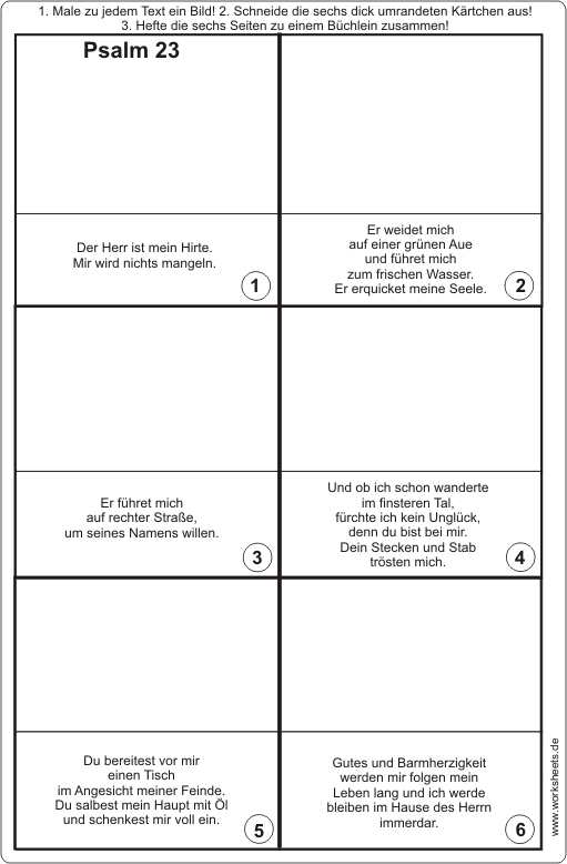 Arbeitsblatt: Zur Herstellung des Büchleins müssen entlang der gestrichelten Linie 6 gleichgroße Seiten ausgeschnitten werden. Wenn sie beschriftet und ausgemalt sind, werden sie zusammen geheftet.