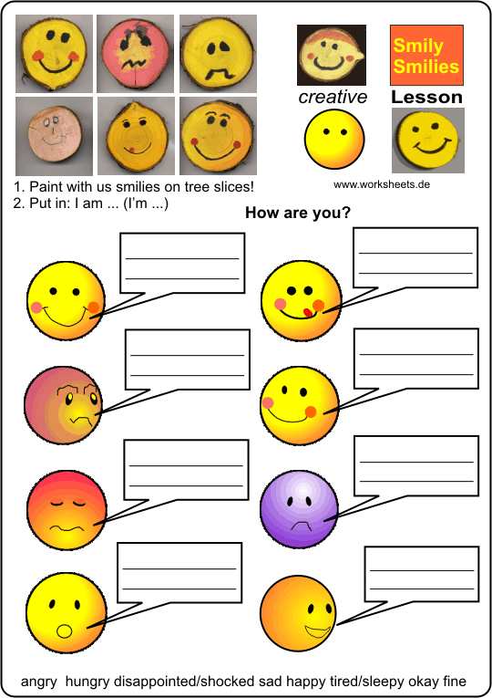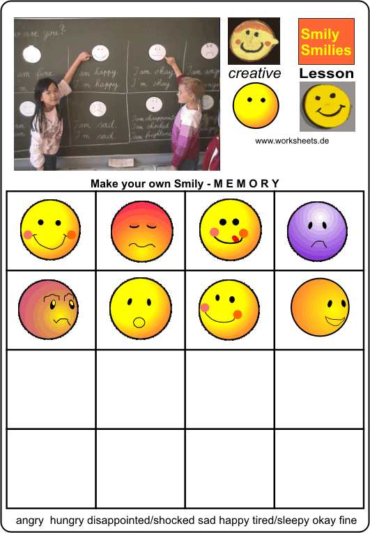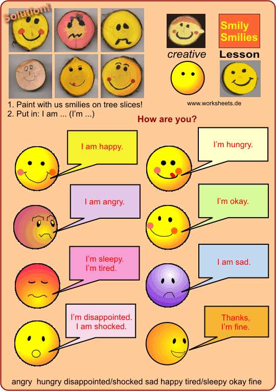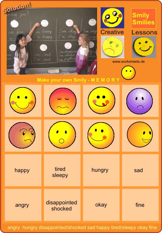 Als stummen Impuls heftet die Lehrerin/der Lehrer die Smilies an die Tafel. Die verschiedenen Stimmungen (moods) können zuerst in Partnerarbeit, dann vor der Klasse vorgespielt werden.Nun fragt L: “How are you?”, zeigt auf jeweils ein Smily und gibt die passende Antwort, z.B.”I am fine.” Anschließend fragt er mehrere Schüler und hilft ihnen zunächst mit den englischen Antworten. Diese Stunde kann innerhalb der Sequenz “Conversation” erfolgen.