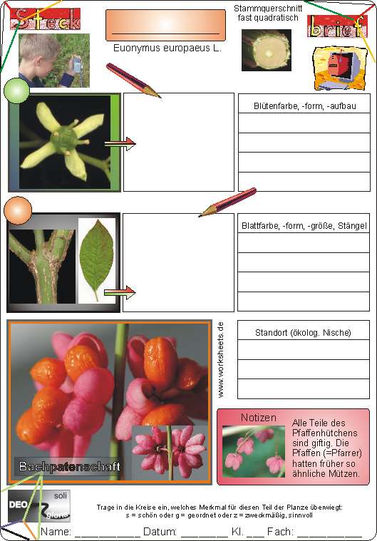 Steckbrief: Pfaffenhütchen Euonymus europaeus L. mit Blüte, Blatt und ökologischer Nische (sie wächst auf Kalkböden in Hecken und in Gärten