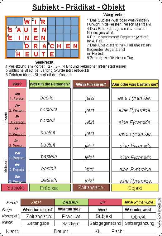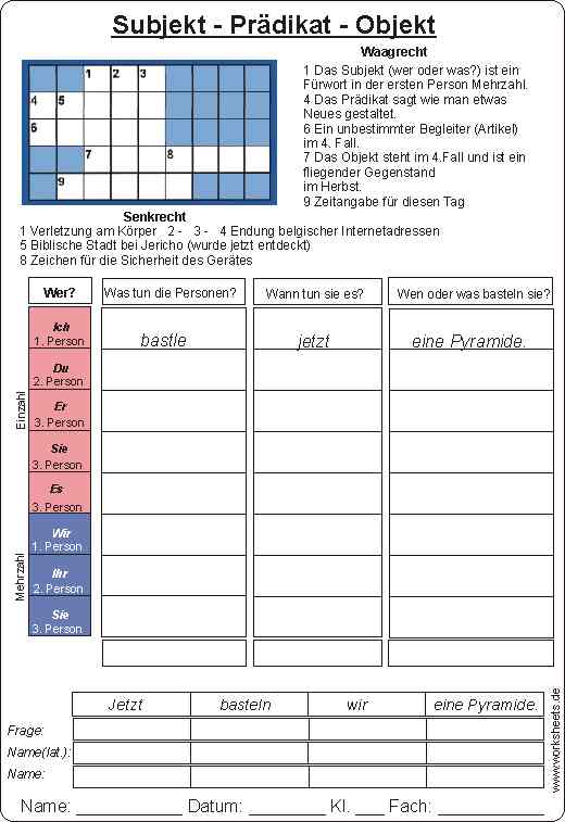 SPO - Subjekt - Prädikat - Objekt - Einstieg mit einem Kreuzworträtsel mit Personenformen und Satzumstellungen