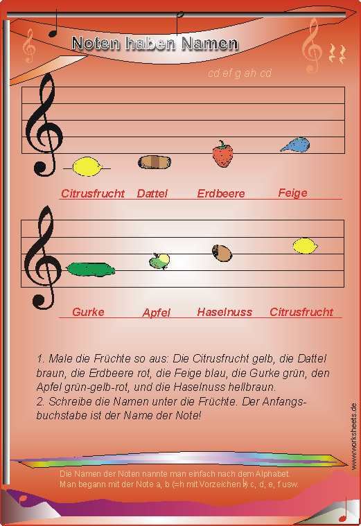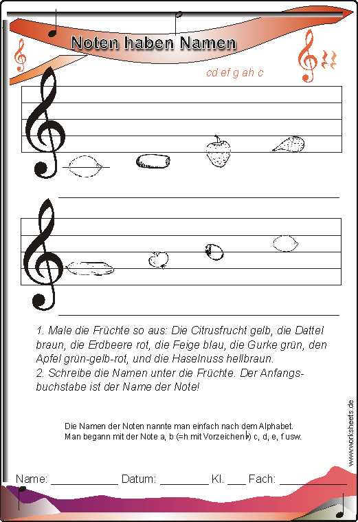 Noten haben Namen: Damit man die Töne eines Liedes, also seine Melodie nicht so leicht vergisst, haben sich die Menschen Namen für die Töne ausgedacht. Dann musste für jeden Ton ein Platz auf, zwischen, über oder unter den fünf Notenlinien gefunden werden. Wir beginnen heute mit der Note “C”, der gelben Citrusfrucht. Ihr Platz ist unterhalb der fünf Notenlinien. Durch sie hindurch geht eine weitere Notenlinie. Die braune Dattel klebt an der untersten Notenlinie, das ist die Note “D”. Auf der ersten Notenlinie hat die rote Erdbeere ihren Platz. Im ersten Zwischenraum befindet sich die blaue Feige.