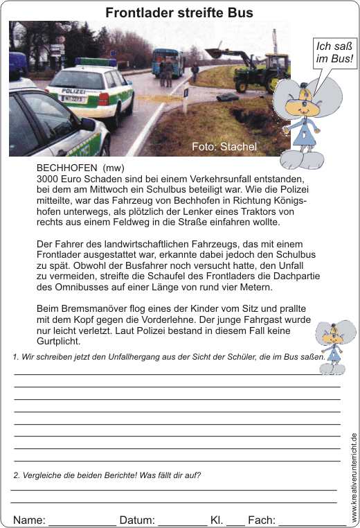 Vergleich eines Zeitungsberichts mit dem persönlichen Bericht der Kinder, die den Unfall miterlebt haben.