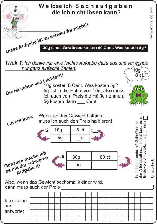 Wie löse ich Sachaufgaben, die ich nicht lösen kann? Sachaufgaben mit Tricks lösen: Trick 1- Ich denke mir eine leichte Aufgabe dazu aus und verwende ganz einfache Zahlen, die ich im Kopf rechnen kann.