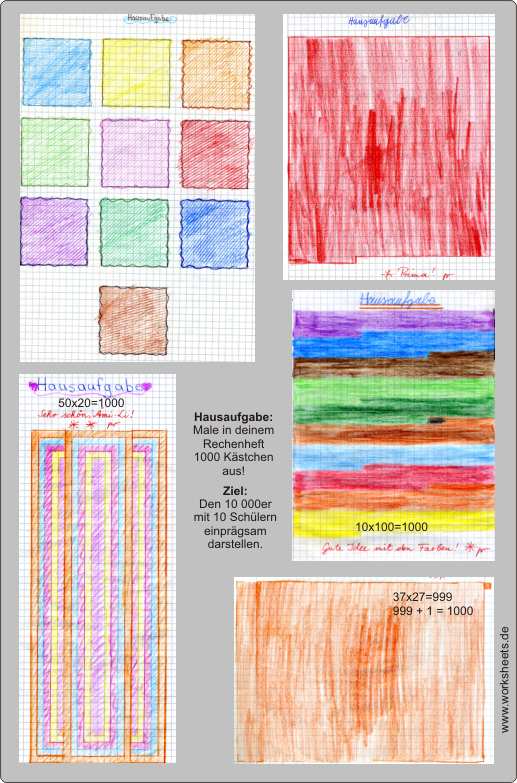 Vorbereitende Hausaufgabe: Male 1000 Kästchen in dein Rechenheft! Ziel: Den Zehntausender mit zehn Schülern einprägsam darstellen.
