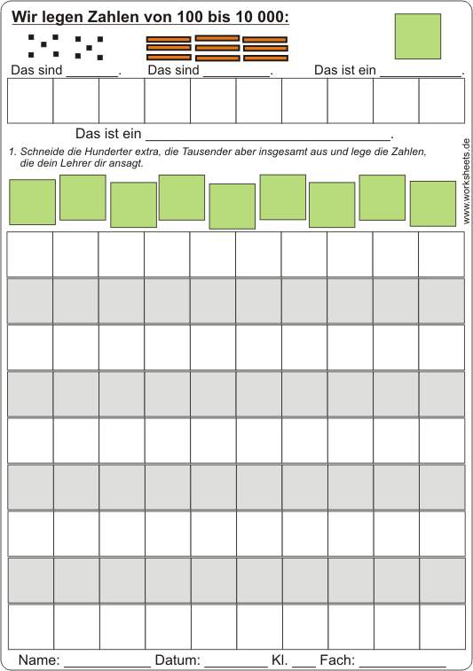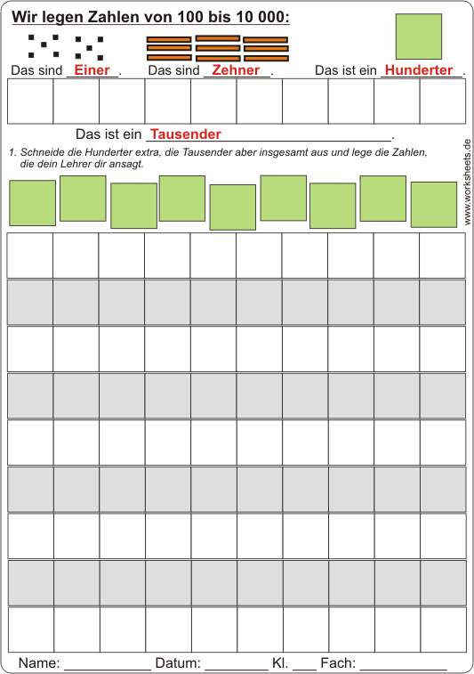 Wir legen Zahlen von 100 bis 10 000. Arbeitsblatt zum Ausschneiden und Legen großer Zahlen.