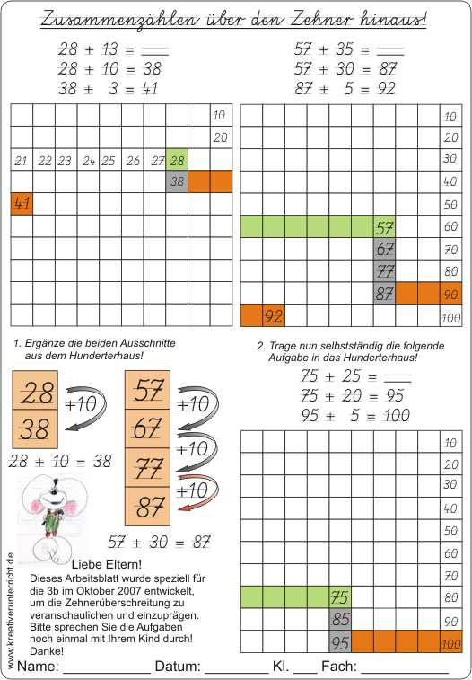 Zusammenzählen über den Zehner hinaus - Zehnerüberschreitung im Hunderterraum ist als Arbeitsblatt 2 nach dem Arbeitsblatt “Entdecke das Zehnersystem” gedacht! Die Zehnerüberschreitung wird hier visualisiert.